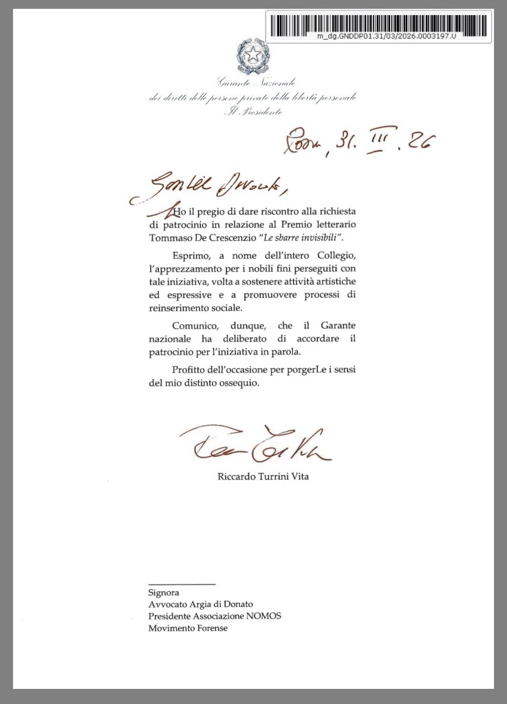 Roma/Napoli – Prosegue il percorso di riconoscimento istituzionale del Premio letterario nazionale “Le sbarre invisibili – Premio Tommaso De Crescenzio”, promosso dall’Associazione NOMOΣ Movimento Forense.