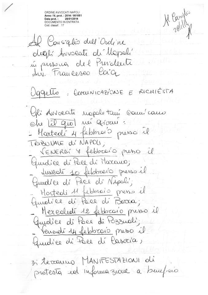 Istanza al Consiglio dell’Ordine degli Avvocati di Napoli proposta dagli avvocati napoletani del 28/01/2014