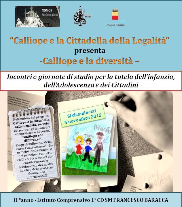 Calliope ritorna ad ispirare gli alunni del Circolo Baracca, nel cuore dei Quartieri spagnoli. Il giorno 5 novembre 2015 presso il Salone dell’Istituto Comprensivo F. M. Baracca, si terrà la presentazione del Progetto Calliope e la Cittadella Della Legalità, nato dalla sinergia tra avvocati (NomoΣ Movimento Forense) e volontari di protezione civile (Centro Studi Acssa) e favorevolmente accolto dalla Preside e dalle insegnanti del Circolo F.M.Baracca, alla sua seconda edizione “Calliope e la Diversità”.