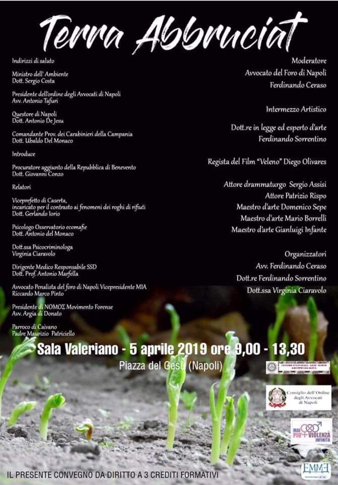 Il Convegno, ideato ed organizzato dall’avv. Ferdinando Ceraso del Foro di Napoli e dalla dott.ssa Virginia Ciaravolo, Psicocriminologa, con la collaborazione del dott. in Legge ed esperto d’arte Ferdinando Sorrentino, e con l’introduzione del Dott. Giovanni Conzo, Procuratore aggiunto della Repubblica di Benevento, da anni in prima linea nella la lotta alla criminalità, prevede gli interventi del dott. Gerlando Iorio, Viceprefetto di Caserta, del dott. Prof Antonio Marfella, Dirigente medico responsabile SSD, del dott. Antonio Del Monaco, psicologo Osservatorio Ecomafie, dell’avv. Argia di Donato, presidente di NomoΣ Movimento Forense, dell’avv. penalista Riccardo Marco Pinto, Vicepresidente dell’Associazione MIA e del parroco di Caivano Padre Maurizio Patriciello.