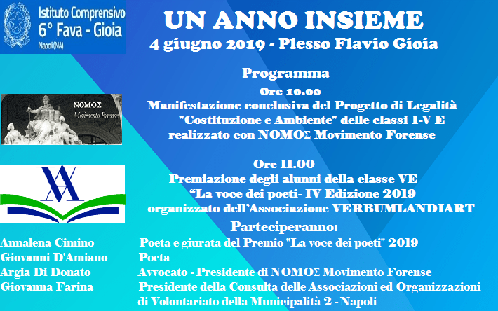 Napoli. Martedì 4 giugno presso l‘Istituto Comprensivo 6° Fava Gioia (Napoli) a partire dalle ore 10,00 nell’ambito della manifestazione organizzata dalla scuola “Un anno insieme”, si premieranno gli studenti delle classi IE e VE del Plesso Flavio Gioia per aver partecipato ai progetti di Legalità “Costituzione e Ambiente” e “Una vita senza plastica” realizzati con l’Associazione NOMOΣ Movimento Forense.