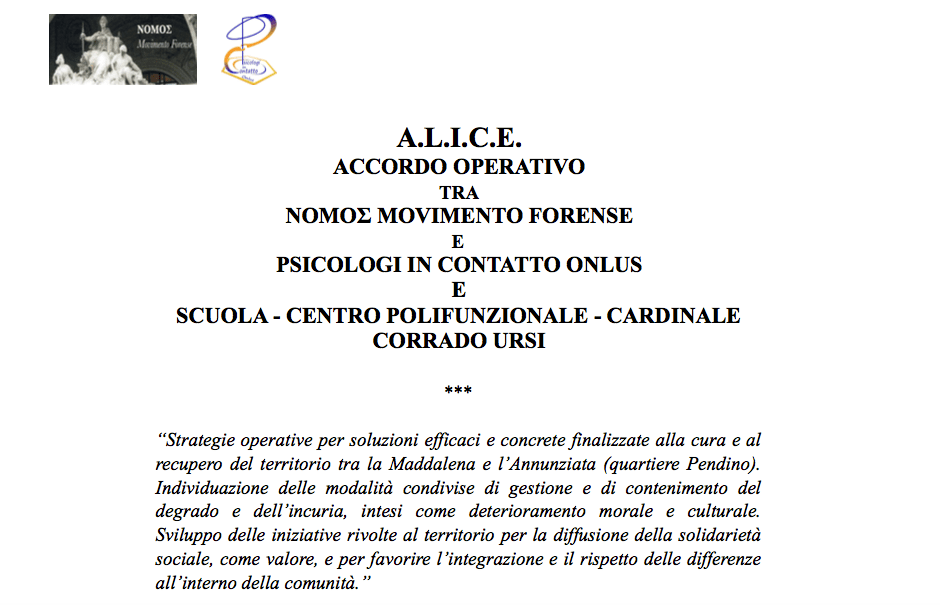 Napoli. Giovedì 5 dicembre 2019, presso la Scuola Cardinale Corrado Ursi in Via dell’Annunziata n. 45, è stato firmato l’accordo operativo tra NOMOΣ Movimento Forense e Psicologi in Contatto Onlus e la Scuola – Centro Polifunzionale – Cardinale Corrado Ursi denominato A.L.I.C.E (Assonanze, Legami, Intrecci, Comunità, Empatia) recante “Strategie operative per soluzioni efficaci e concrete finalizzate alla cura e al recupero del territorio tra la Maddalena e l’Annunziata (quartiere Pendino). Individuazione delle modalità condivise di gestione e di contenimento del degrado e dell’incuria, intesi come deterioramento morale e culturale. Sviluppo delle iniziative rivolte al territorio per la diffusione della solidarietà sociale, come valore, e per favorire l’integrazione e il rispetto delle differenze all’interno della comunità.”