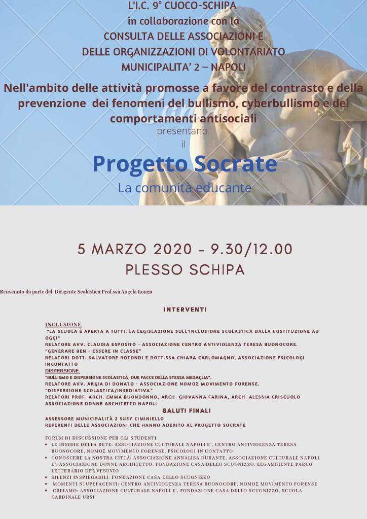 Napoli. Giovedì 5 marzo 2020, a partire dalle h. 9.30, presso l’Istituto Comprensivo 9°Cuoco – Schipa, si svolgerà la presentazione del Progetto Socrate, ideato da NOMOΣ Movimento Forense con l’adesione e la collaborazione della Consulta delle Associazioni e delle Organizzazioni di volontariato della Municipalità 2 di Napoli.