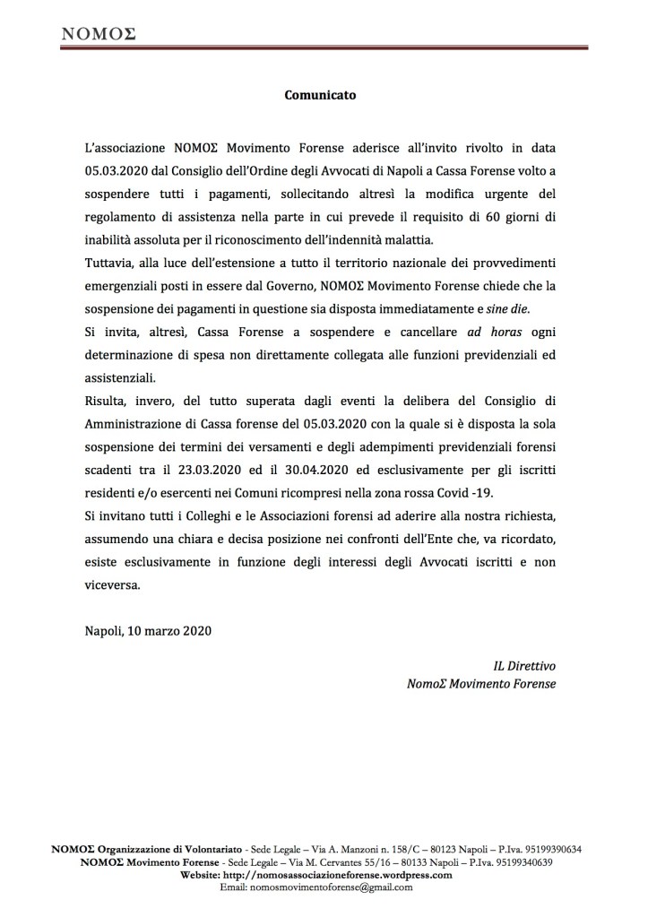 L’associazione NOMOΣ Movimento Forense aderisce all’invito rivolto in data 05.03.2020 dal Consiglio dell’Ordine degli Avvocati di Napoli a Cassa Forense volto a sospendere tutti i pagamenti, sollecitando altresì la modifica urgente del regolamento di assistenza nella parte in cui prevede il requisito di 60 giorni di inabilità assoluta per il riconoscimento dell’indennità malattia. Tuttavia, alla luce dell’estensione a tutto il territorio nazionale dei provvedimenti emergenziali posti in essere dal Governo, NOMOΣ Movimento Forense chiede che la sospensione dei pagamenti in questione sia disposta immediatamente e sine die.