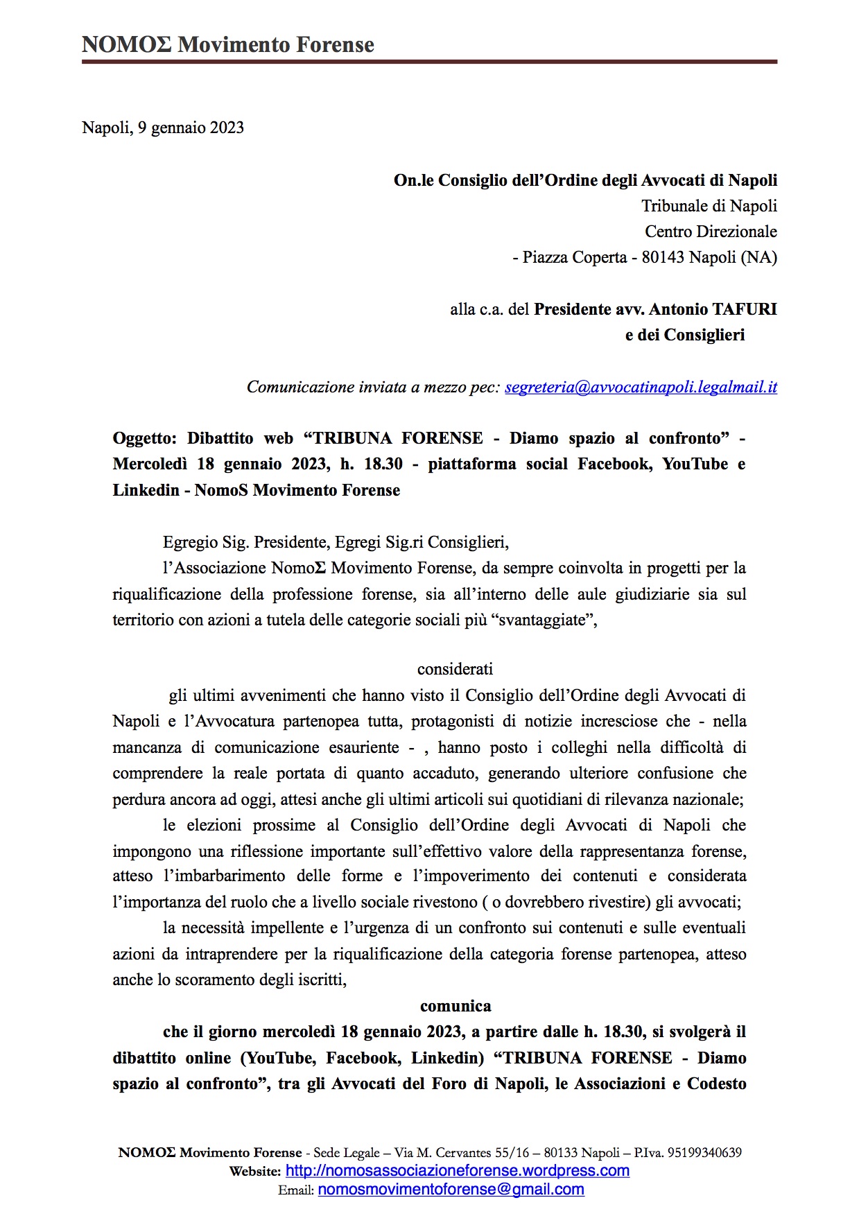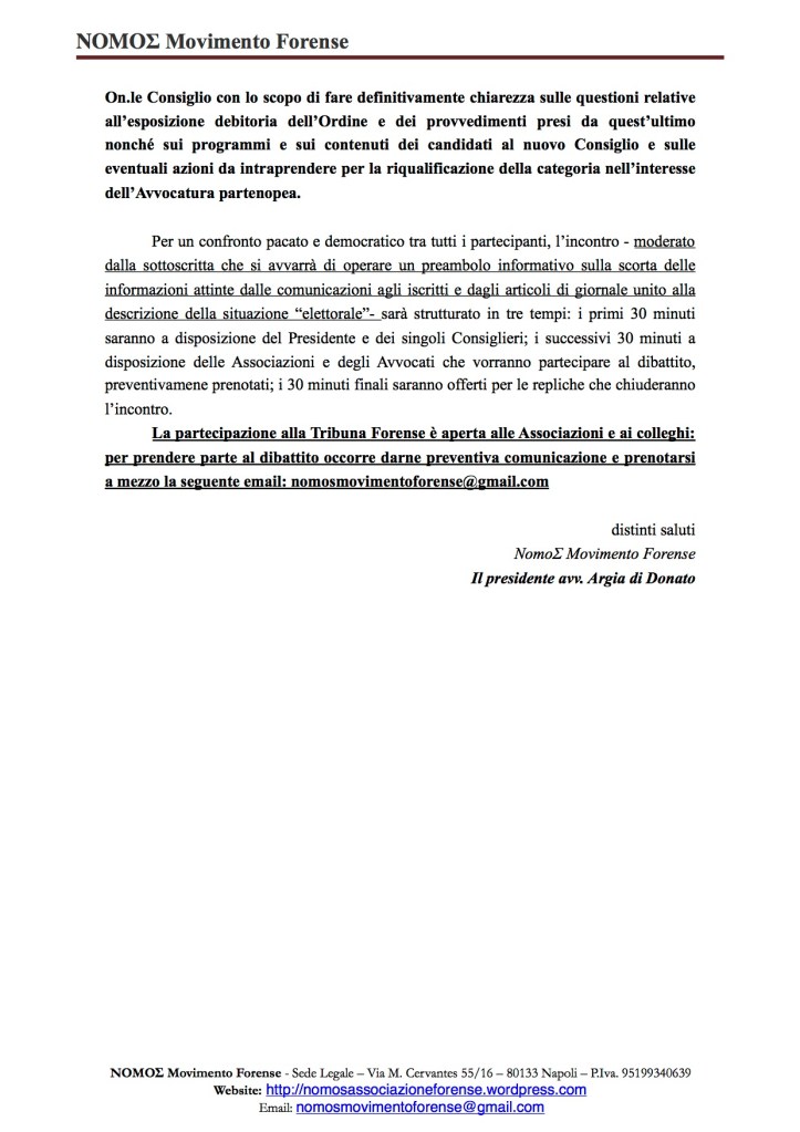 In data odierna abbiamo provveduto ad inviare il nostro invito al Consiglio dell’Ordine degli Avvocati di Napoli