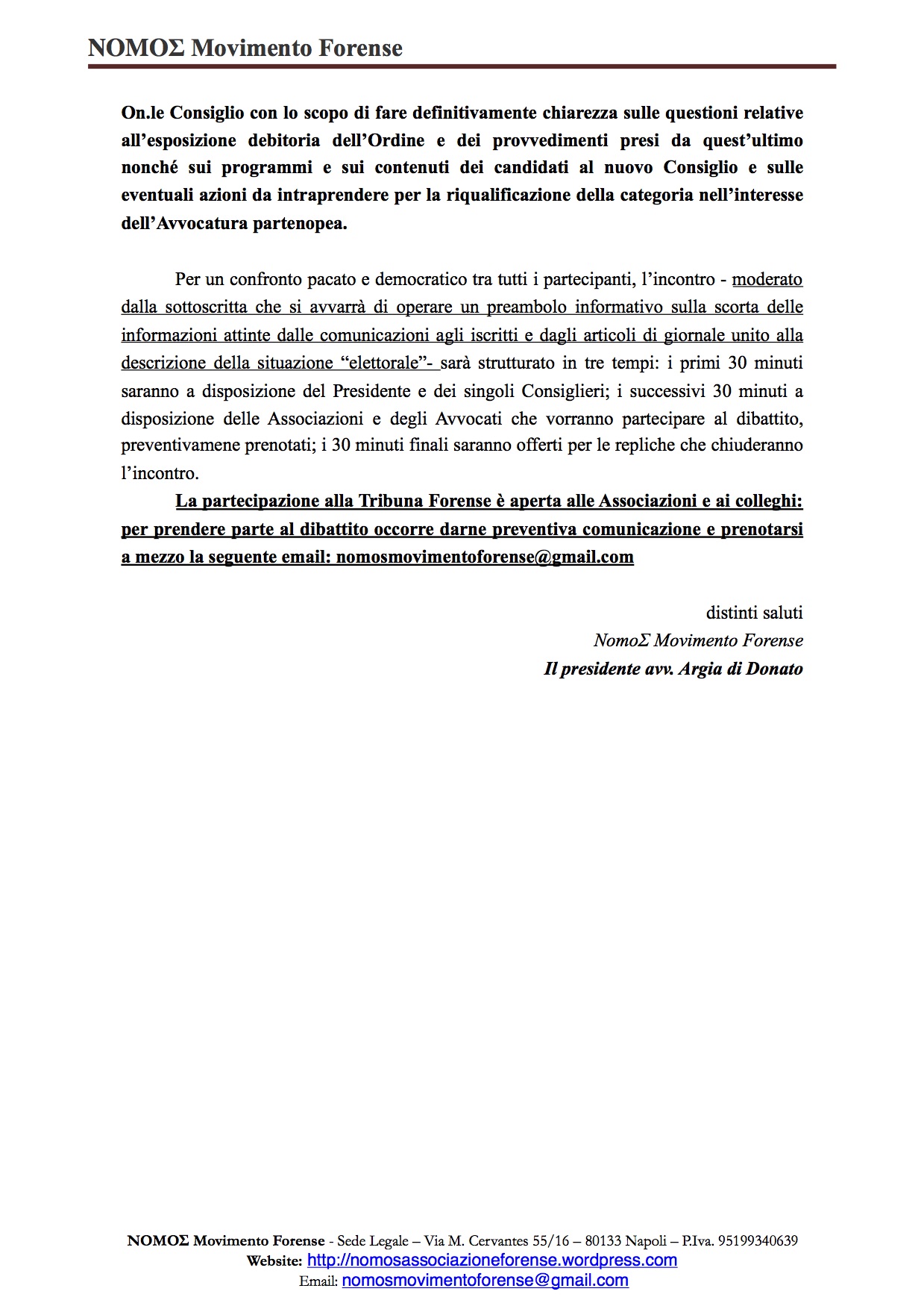 Per un confronto pacato e democratico tra tutti i partecipanti, l’incontro – moderato dall’Avv. Argia di Donato, Presidente di NomoΣ Movimento Forense che si avvarrà di operare un preambolo informativo sulla scorta delle informazioni attinte dalle comunicazioni agli iscritti e dagli articoli di giornale unito alla descrizione della situazione “elettorale”- sarà strutturato in tre tempi: i primi 30 minuti saranno a disposizione del Presidente e dei Consiglieri; i successivi 30 minuti a disposizione delle Associazioni e degli Avvocati che vorranno partecipare al dibattito, preventivamene prenotati; i 30 minuti conclusivi saranno offerti per le repliche che chiuderanno l’incontro.