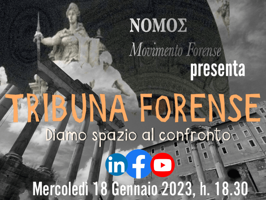 Dibattito web “TRIBUNA FORENSE – Diamo spazio al confronto” – Mercoledì 18 gennaio 2023, h. 18.30 – piattaforma social Facebook, YouTube e Linkedin – NomoS Movimento Forense