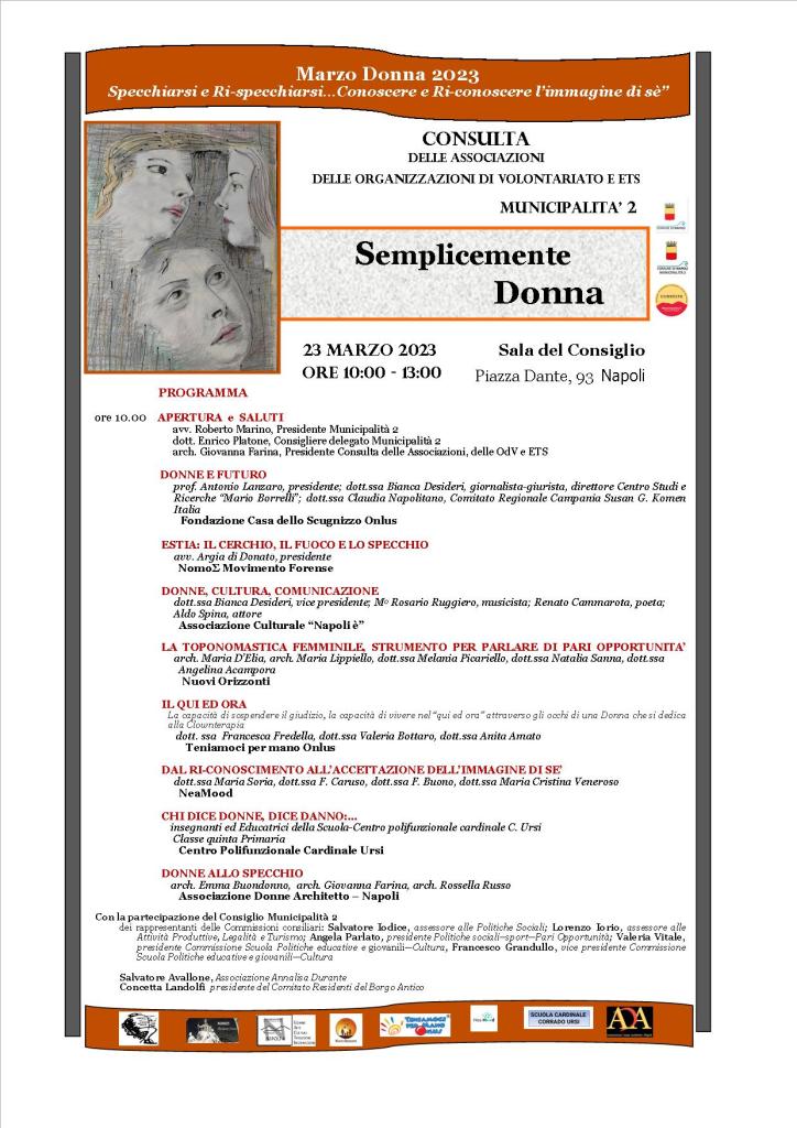 L’evento rientra nel programma Marzo Donna promosso dal Comune di Napoli “Marzo Donna 2023 – Specchiarsi e Ri-specchiarsi…Conoscere e Ri-conoscere l’immagine di sè”.