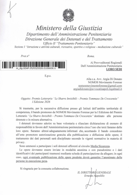 L’Associazione NOMOΣ Movimento Forense esprime profonda gratitudine per la tempestiva e significativa risposta ricevuta dal Dipartimento dell’Amministrazione Penitenziaria del Ministero della Giustizia, che ha disposto la diffusione del bando della prima edizione del Premio letterario nazionale “Le sbarre invisibili – Premio Tommaso De Crescenzio” presso i Provveditorati Regionali dell’Amministrazione Penitenziaria.