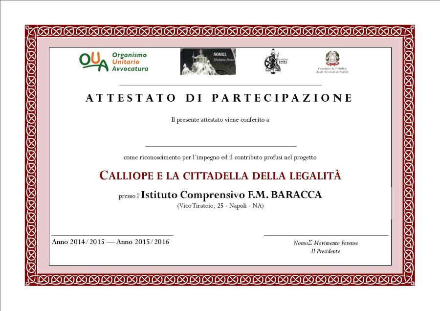 Il Diplomino della Legalità rilasciato agli alunni dell’IC F. Baracca per il biennio 2014-15/ 2015-16