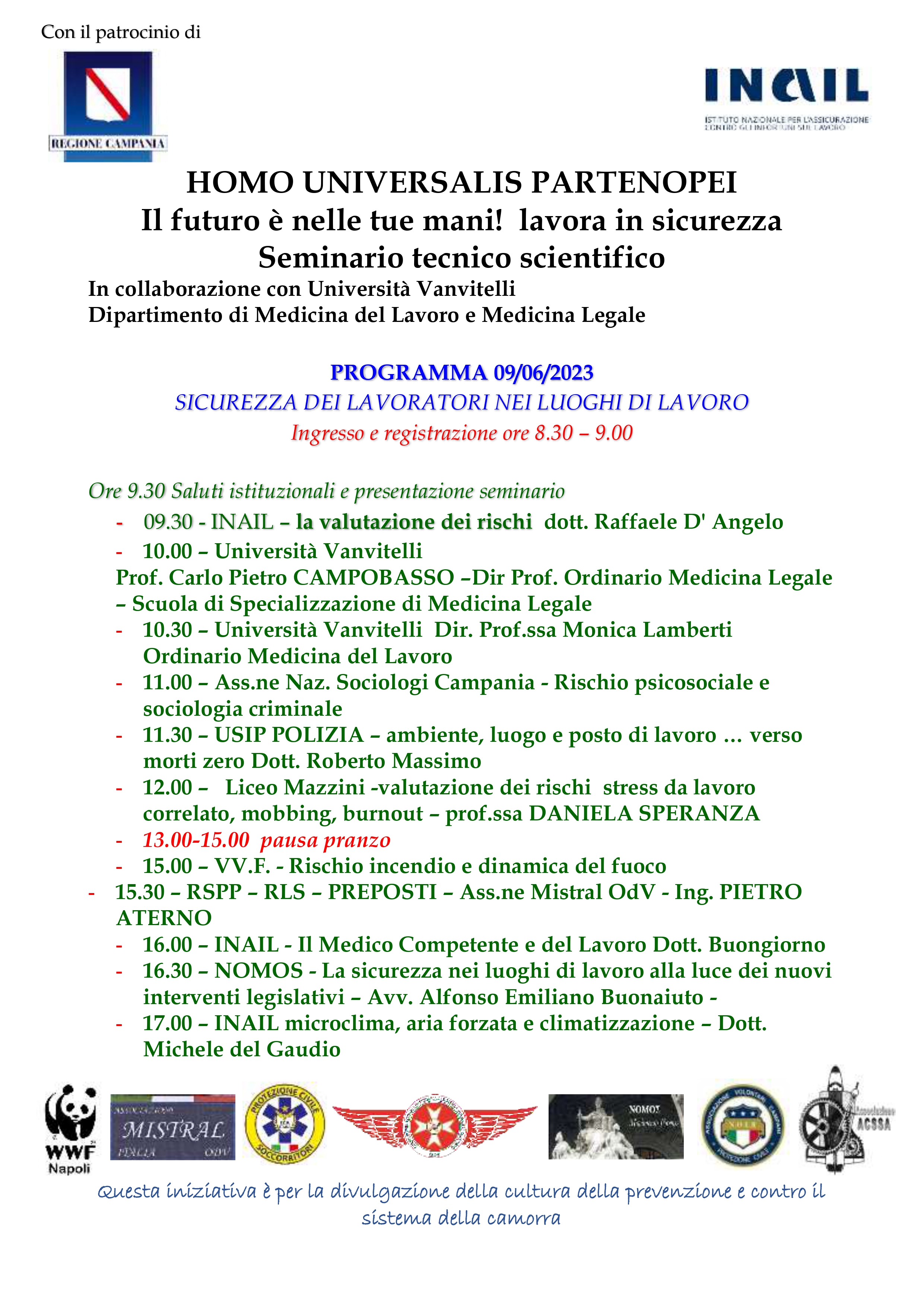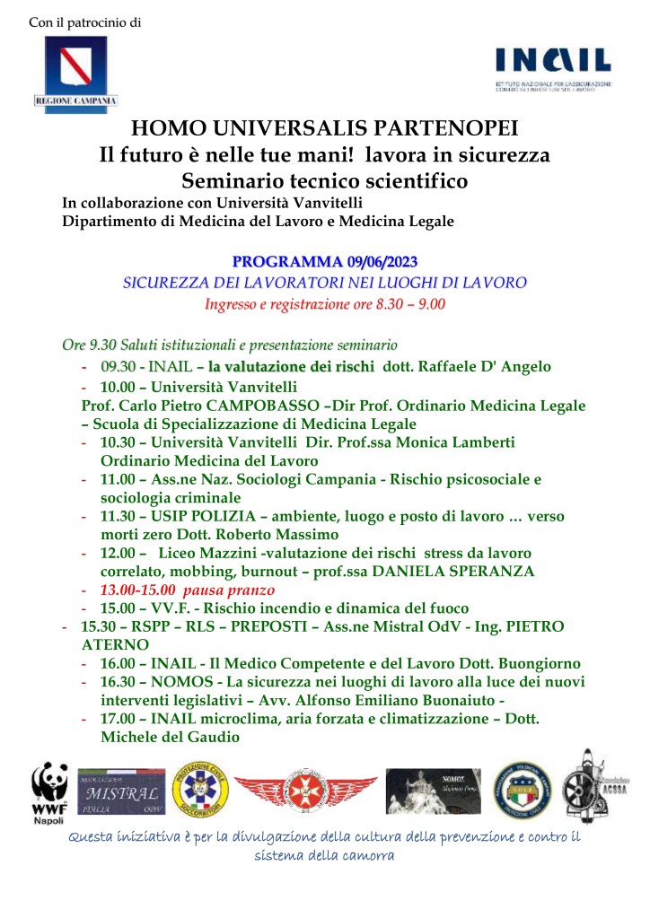 Ieri9 giugno, si è svolta la prima giornata de “Il futuro è nella tue mani! Lavora in sicurezza”, seminario tecnico scientifico ideato da Acssa Centro Studi, Mistral ODV e INAILDirezione regionale della Campania, in collaborazione con l’Università Vanvitelli, Dipartimento di Medicina del Lavoro e Medicina Legale, tenutosi a Napoli presso la sede congressuale INAIL di Villa Colonna Bandini dalle ore 9.00 alle ore 18.00, con la collaborazione e partecipazione di numerose associazioni ed Enti, tra cui ANM Azienda Napoletana Mobilità, WWF Napoli, TDB Italia Odv, AVC NOER, UNIVERSO HUMANITAS, NOMOΣ Movimento Forense, Ortopedia Zungri, Ass.ne Naz. Sociologi Campania, USIP Polizia, Ordine Ingegneri Napoli, Associazione Nazionale Sociologi Campania, Movimento Blu ed Associazione Nazionale Carabinieri. Con il patrocinio della Regione Campania, del Vescovato, degli ingegneri Inail ANM.