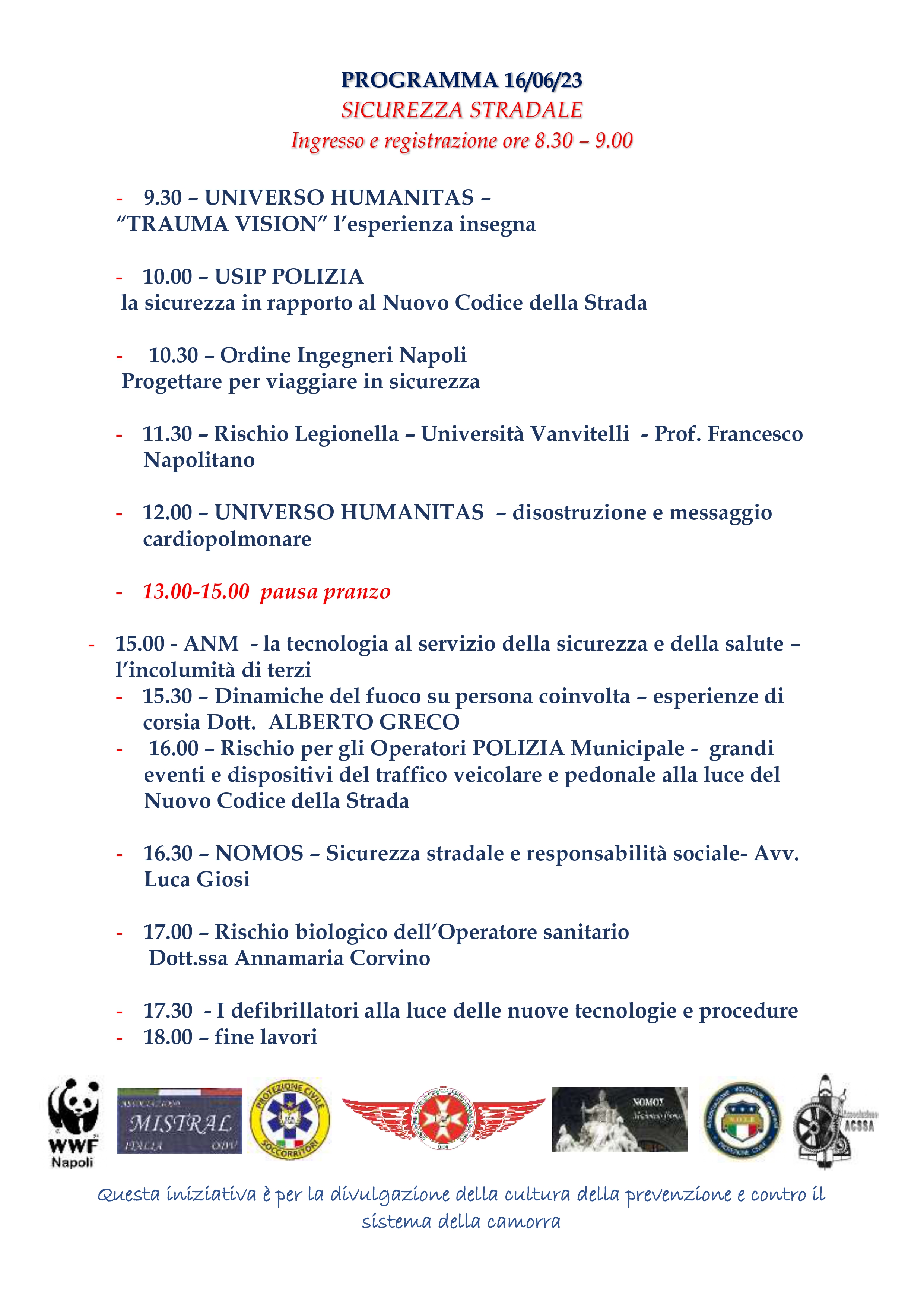 Partecipano ANM Azienda Napoletana Mobilità, WWF Napoli, TDB Italia Odv, AVC NOER, UNIVERSO HUMANITAS, NOMOΣ Movimento Forense, Ortopedia Zungri, Ass.ne Naz. Sociologi Campania, USIP Polizia, Ordine Ingegneri Napoli, Associazione Nazionale Sociologi Campania, Forze Armate.