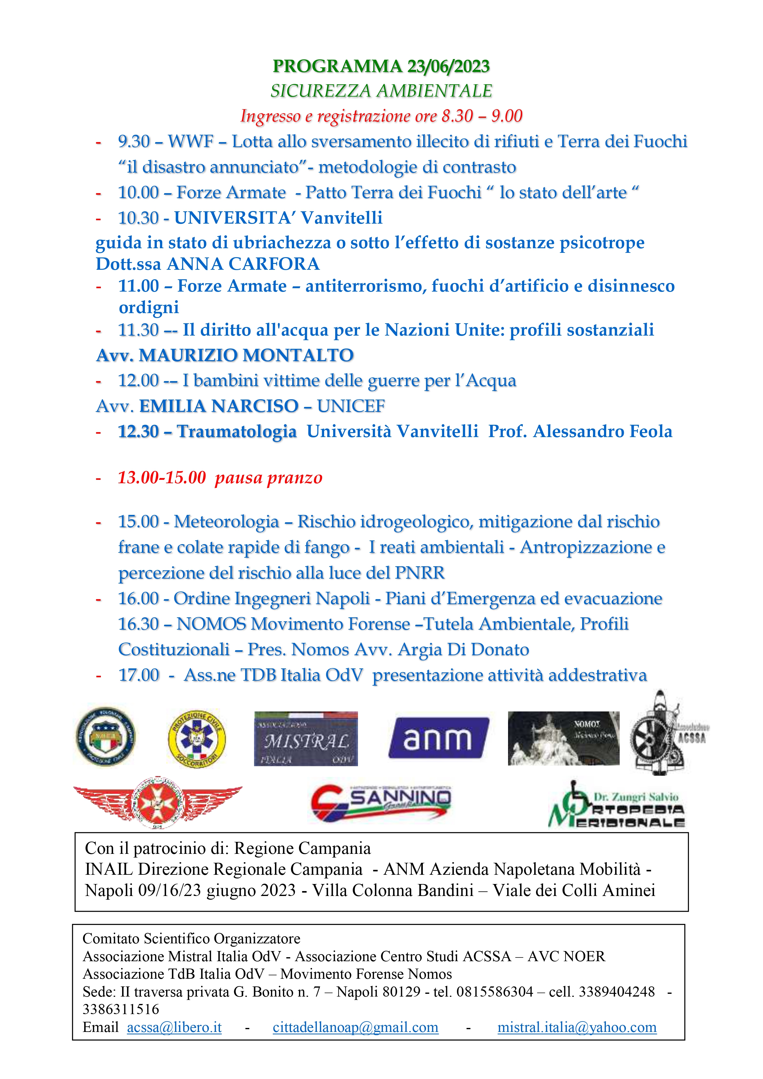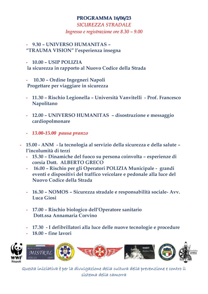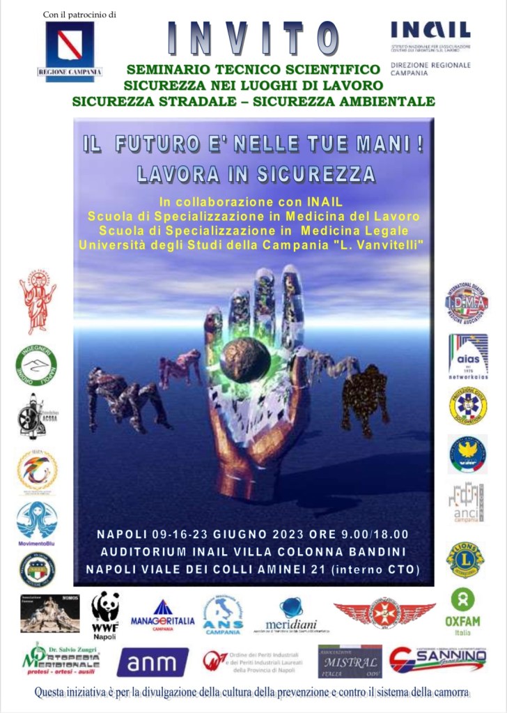 Con oggi, 23 giugno, si è concluso il ciclo di incontri “Il futuro è nella tue mani! Lavora in sicurezza”, seminario tecnico scientifico articolato in tre giornate dedicate ai temi della Sicurezza sui luoghi di lavoro, Sicurezza stradale e Sicurezza ambientale, ideato da Acssa Centro Studi, Mistral ODV e INAIL Direzione regionale della Campania, con la collaborazione di NOMOΣ Movimento Forense e dell’Università Vanvitelli, Dipartimento di Medicina del Lavoro e Medicina Legale, svoltosi a Napoli presso la sede congressuale INAIL di Villa Colonna Bandini, con la partecipazione di numerose associazioni ed Enti, tra cui ANM Azienda Napoletana Mobilità, WWF Napoli, TDB Italia Odv, AVC NOER, UNIVERSO HUMANITAS, , Ortopedia Zungri, Ass.ne Naz. Sociologi Campania, USIP Polizia, Ordine Ingegneri Napoli, Associazione Nazionale Sociologi Campania, Movimento Blu ed Associazione Nazionale Carabinieri. Con il patrocinio della Regione Campania, del Vescovato, degli ingegneri Inail ANM.