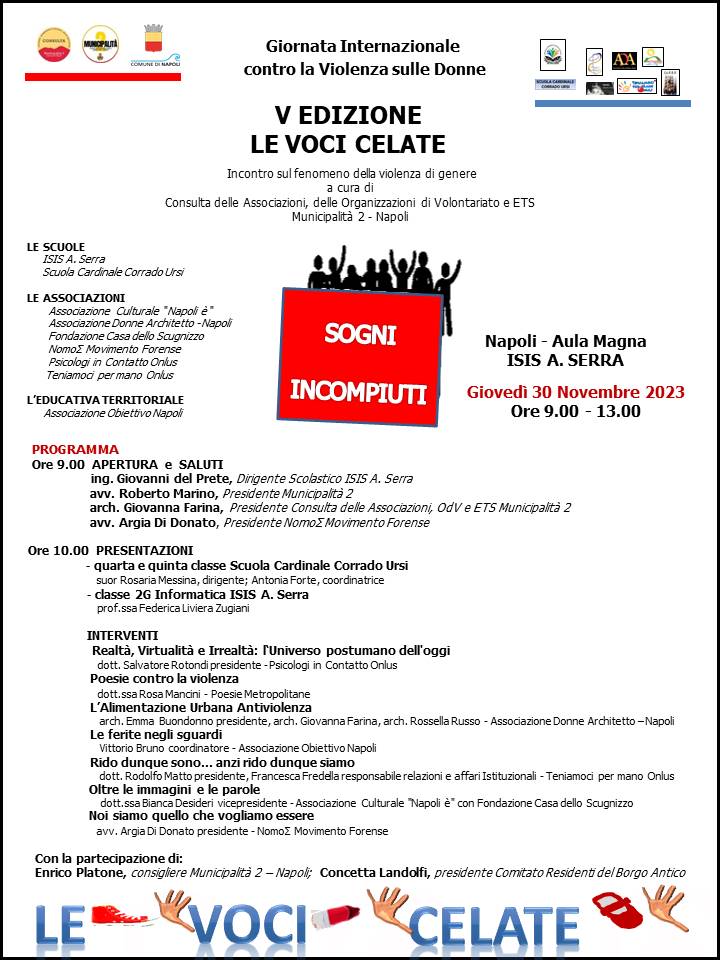 Dopo la prima edizione del 30 novembre 2017 (presso il Liceo A. Genovesi) la seconda edizione del 28 novembre (presso l’I.C. Cuoco – Schipa), la terza edizione del 29 novembre 2019 (presso il 31o I.C. P. Borsellino), la quarta edizione del 28 novembre 2022 (presso il 31o I.C. P. Borsellino), Le Voci Celate – per quest’anno – ritornano a gridare il proprio dissenso contro i fenomeni di violenza minorile. Un omaggio a tutti quei “sogni incompiuti” di chi, vittima di comportamenti e azioni antigiuridiche, non potrà mai più veder realizzati.
