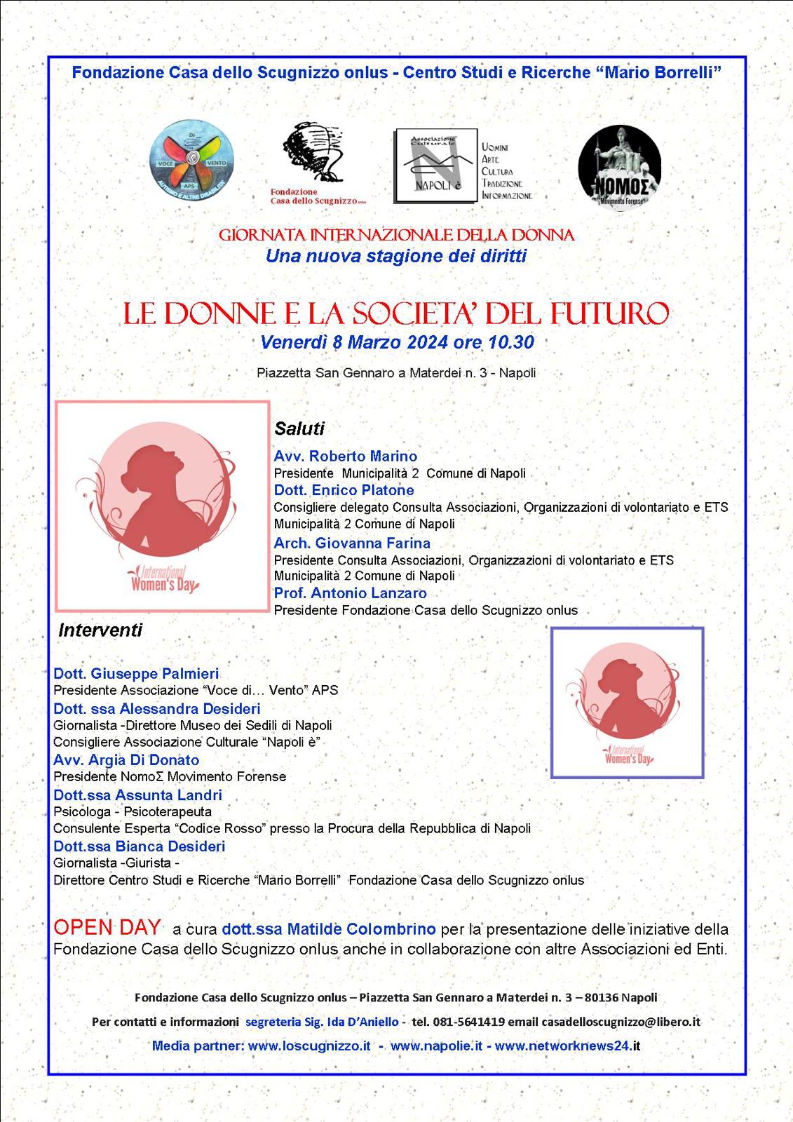 Gli avvocati di NomoΣ Movimento Forense partecipano domani, 8 marzo, a partire dalle h. 10,30 all’incontro di informazione e formazione dal titolo “Una nuova stagione di diritti: Le Donne e la Società del futuro” organizzato in occasione della “Giornata internazionale della Donna” e del Marzo Donna 2024, dalla Fondazione Casa dello Scugnizzo onlus – Centro Studi e Ricerche “Mario Borrelli”, in piazzetta San Gennaro a Materdei n. 3, Napoli.