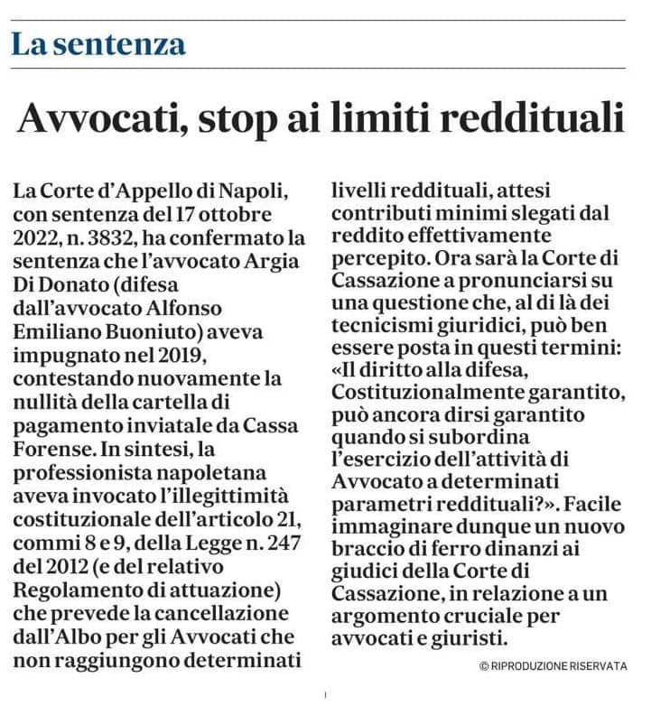 La Corte d’Appello di Napoli, con sentenza del 17 ottobre 2022, n. 3832, ha confermato la sentenza che l’Avv. Di Donato aveva impugnato nel 2019, contestando nuovamente la nullità della cartella di pagamento inviatale da Cassa Forense invocando l’illegittimità costituzionale dell’articolo 21, commi 8 e 9, della Legge n. 247 del 2012 (e del relativo Regolamento di attuazione) che prevede la cancellazione dall’Albo per gli Avvocati che non raggiungono determinati livelli reddituali, attesi contributi minimi slegati dal reddito effettivamente percepito.